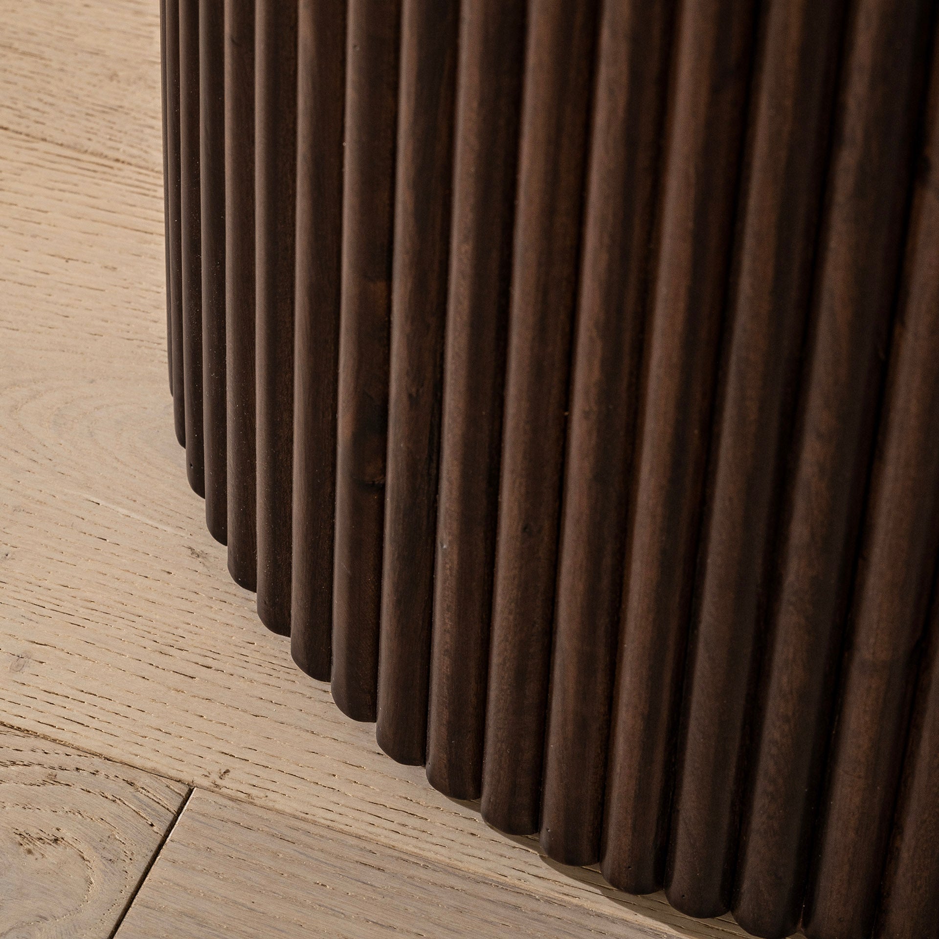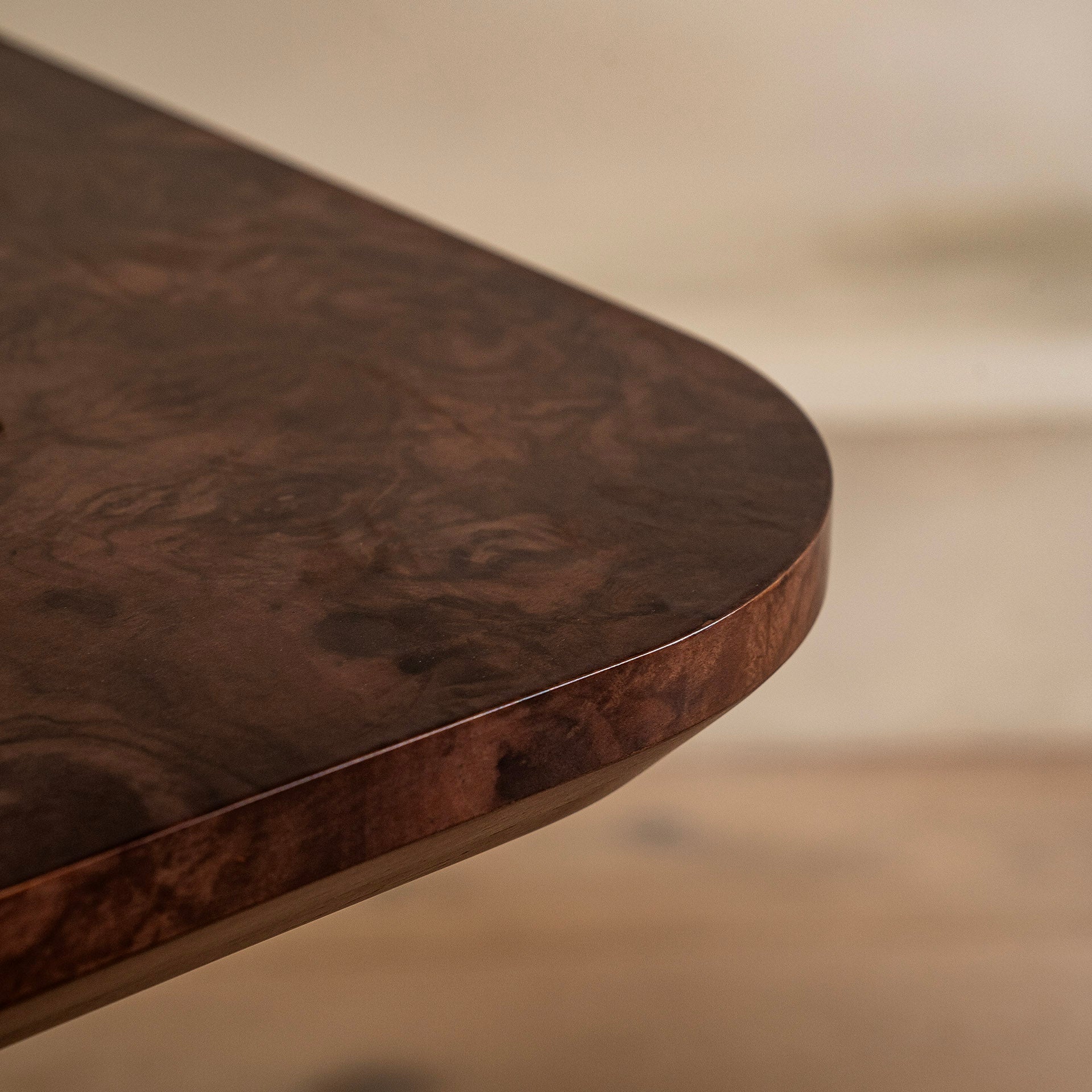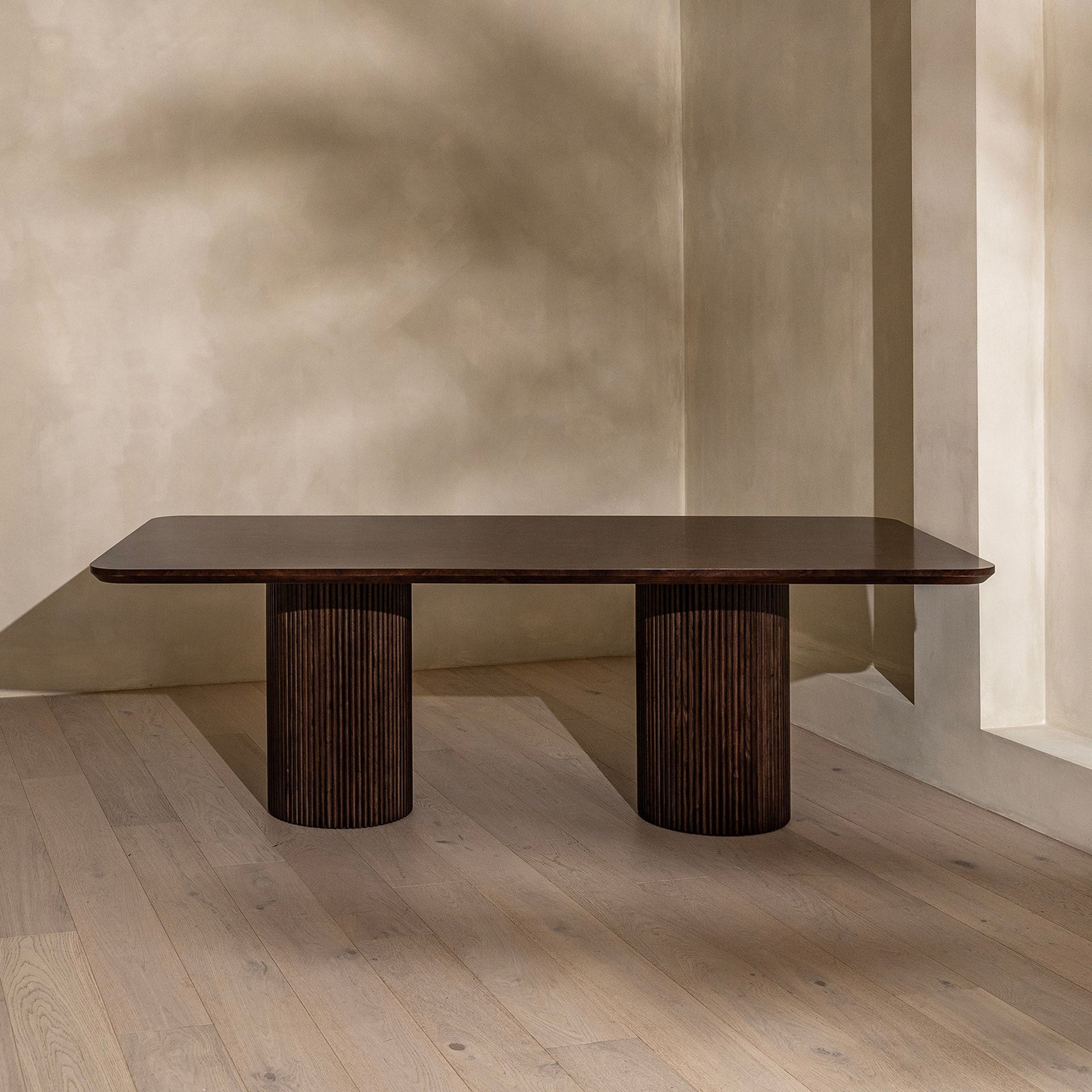 The striking fluted wood legs add sculptural detail, while the broad tabletop and deep dark burl finish create a bold, refined look that commands attention.