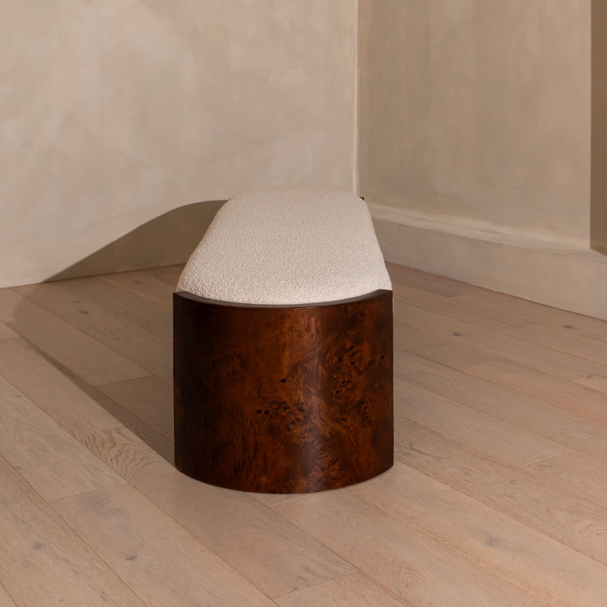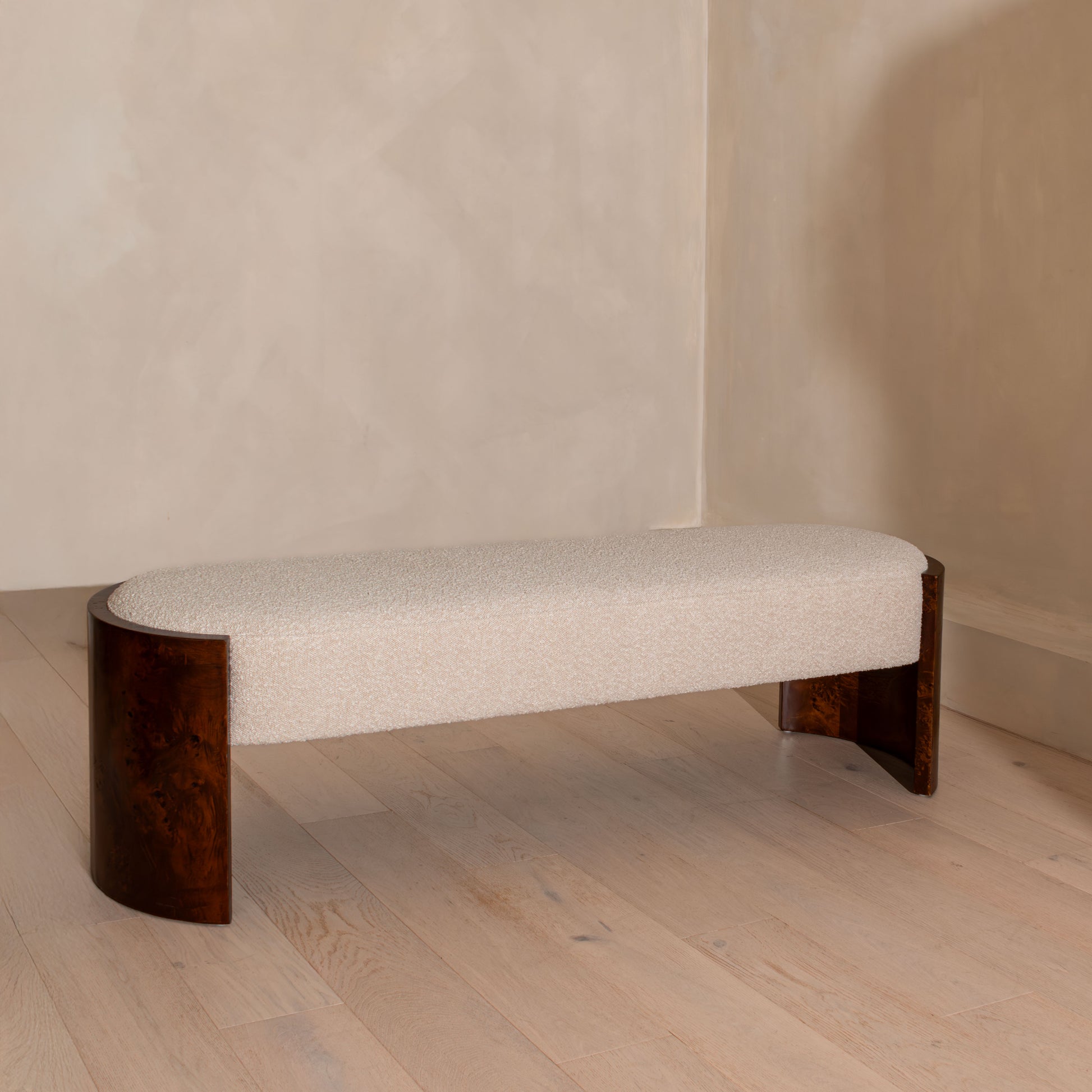 Crafted with rich dark burl wood legs, the bench showcases the natural beauty of wood grain, adding a unique sculptural element to your entryway, bedroom, or living space. The combination of soft ivory upholstery and warm wood tones creates a timeless aesthetic that complements both modern and classic interiors.