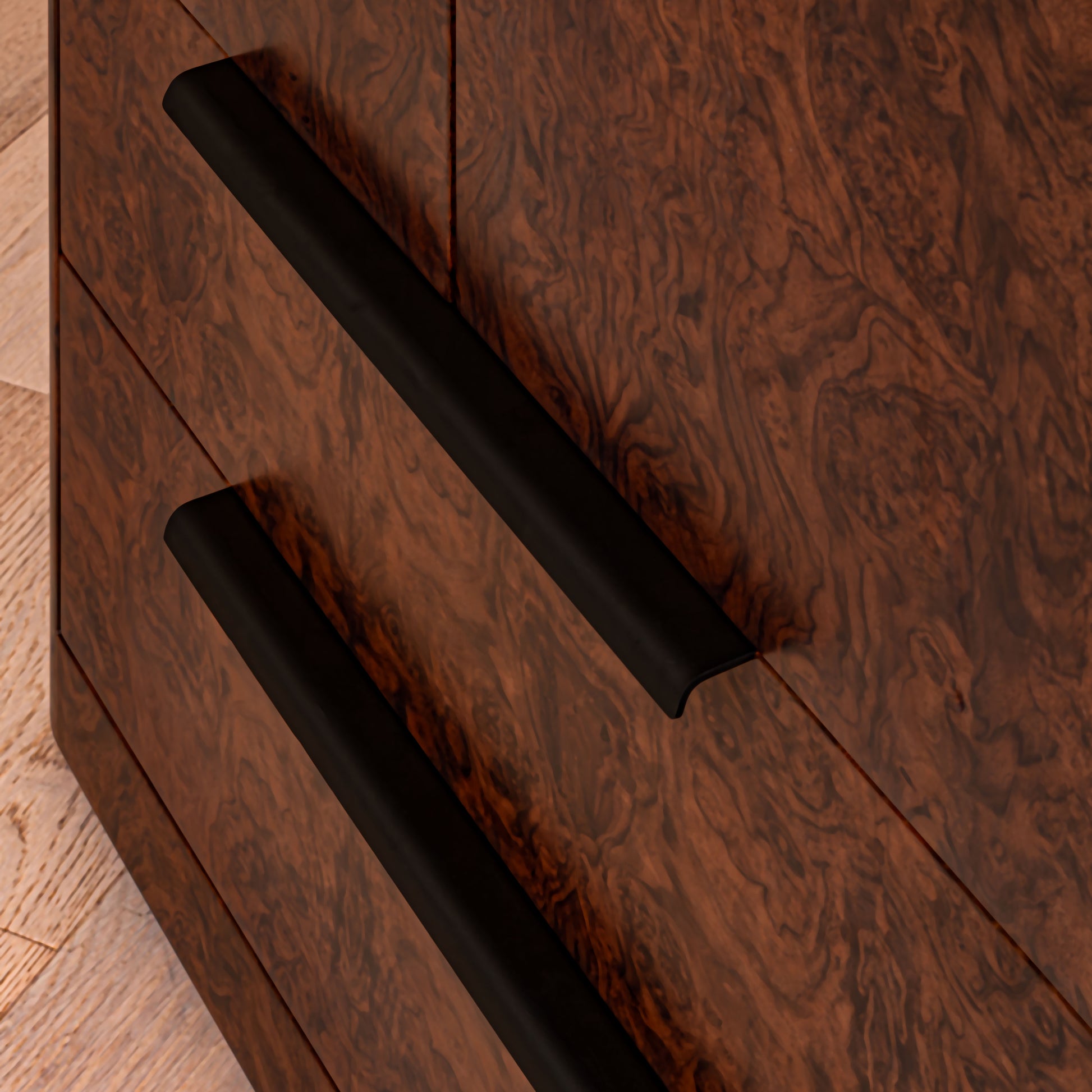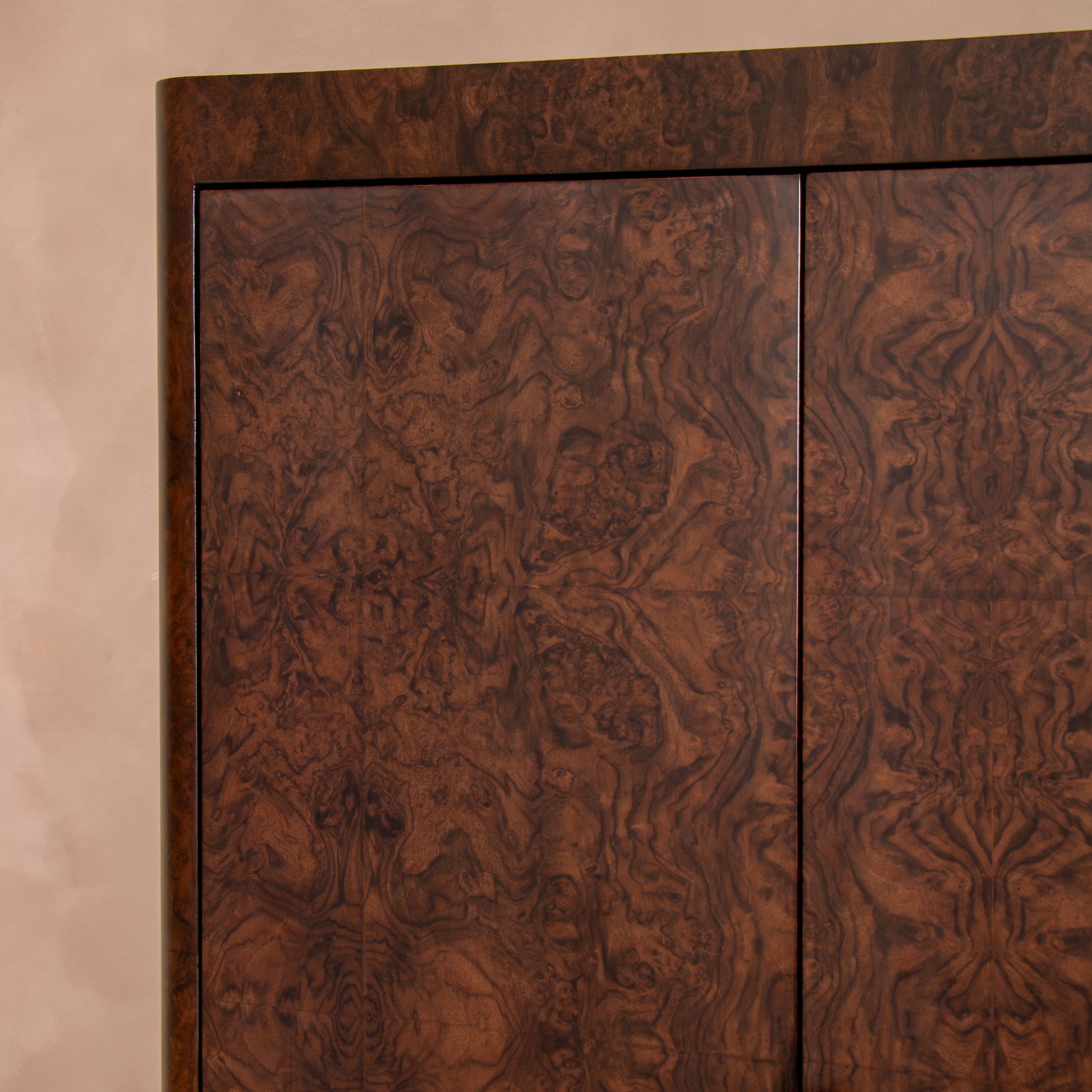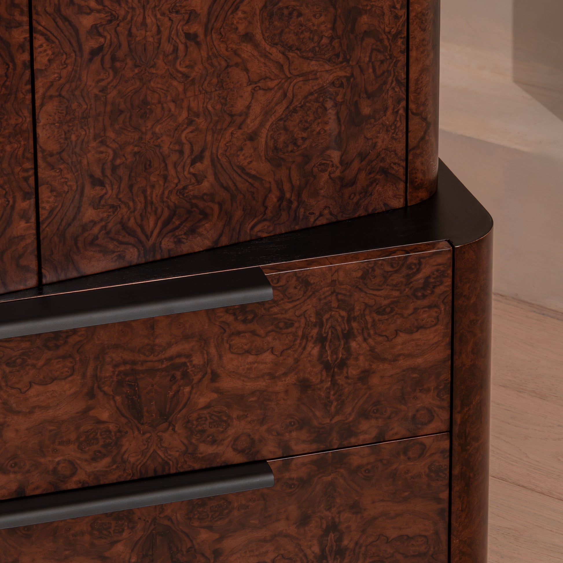The Abingdon Freestanding Wardrobe combines timeless elegance with practical design, showcasing a luxurious dark chocolate burl veneer and a commanding tall silhouette. Beyond its striking appearance, this wardrobe offers everyday functionality with a sturdy metal hanging rail and two black felt-lined drawers in the lower section, perfect for storing clothing and accessories.
