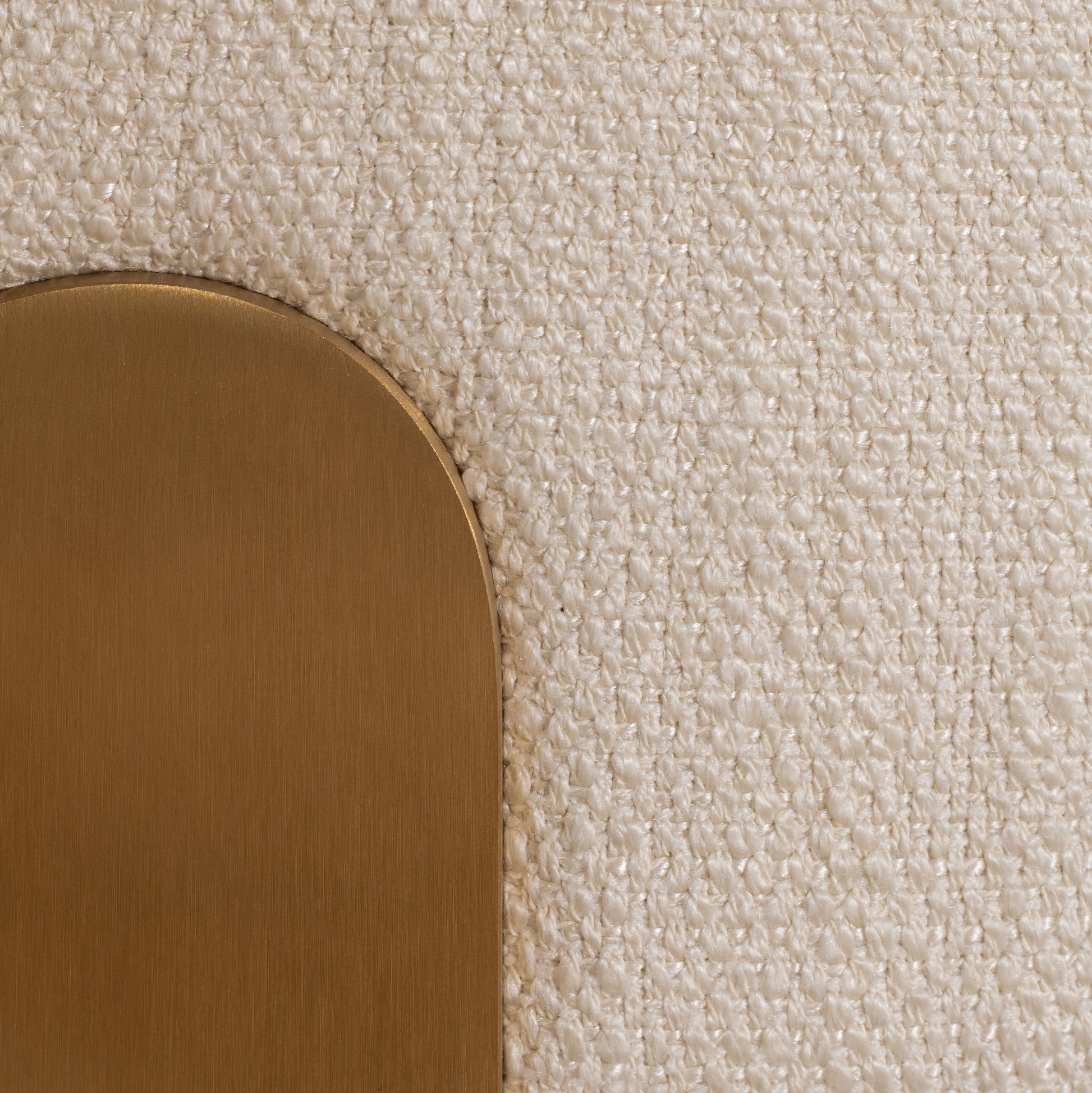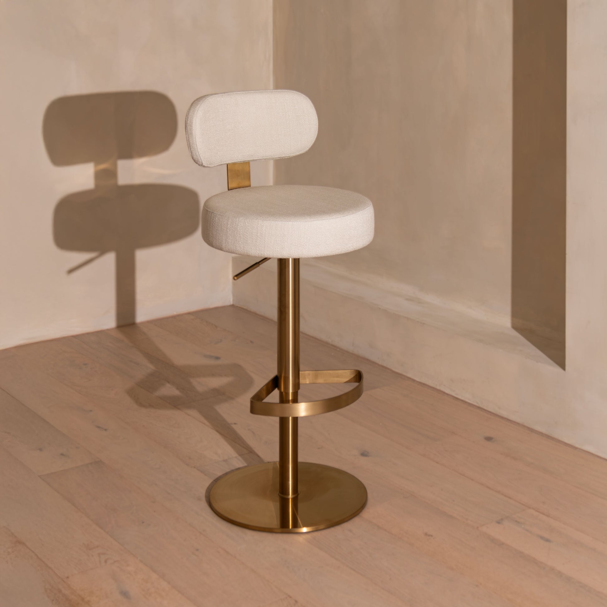 The Bower Bar Stool offers a clean, modern silhouette with its curved bouclé seat, brushed gold stainless-steel base, and integrated footrest. Designed for everyday comfort, it features a smooth gas-lift height adjustment and standard swivel, perfect for contemporary kitchens and bar areas.