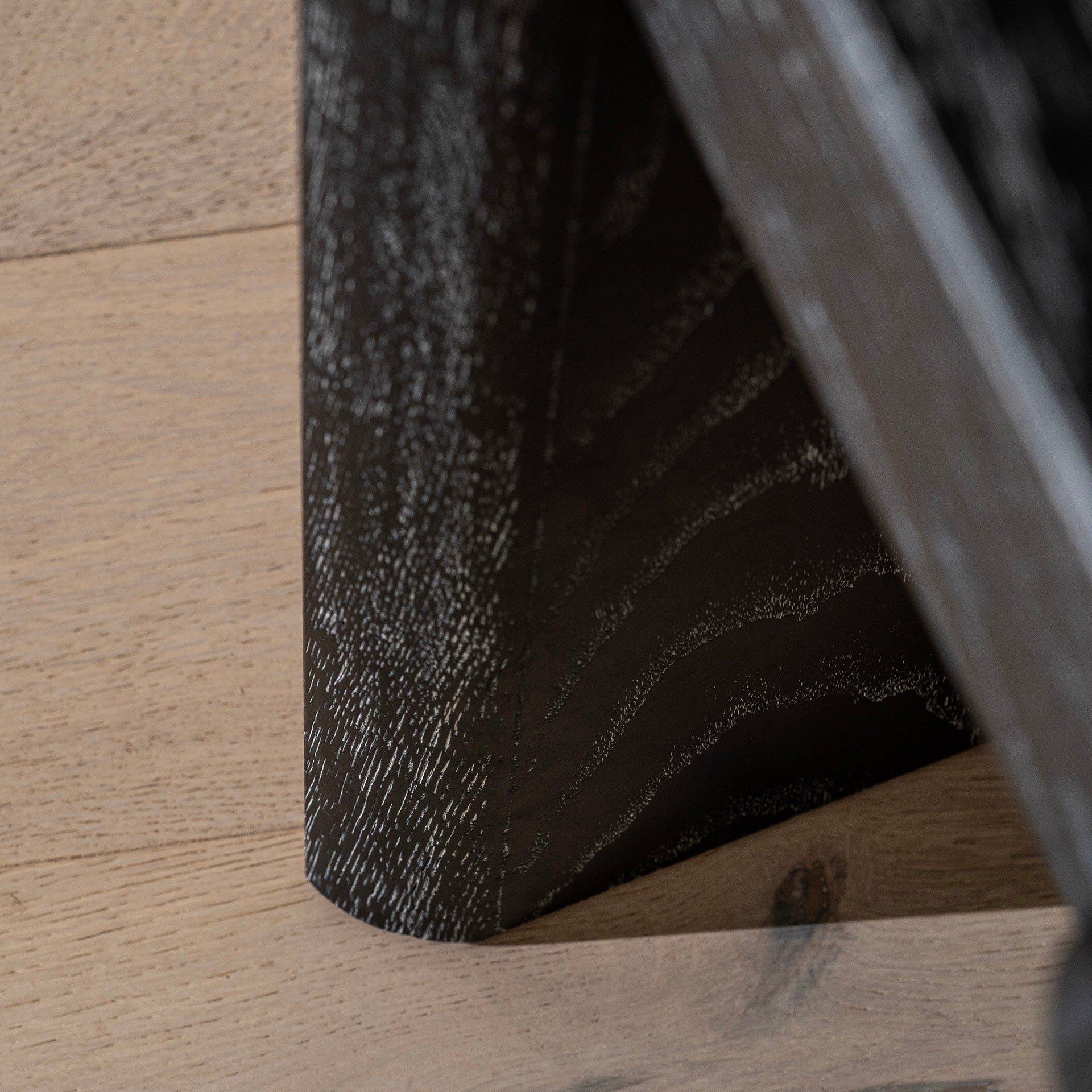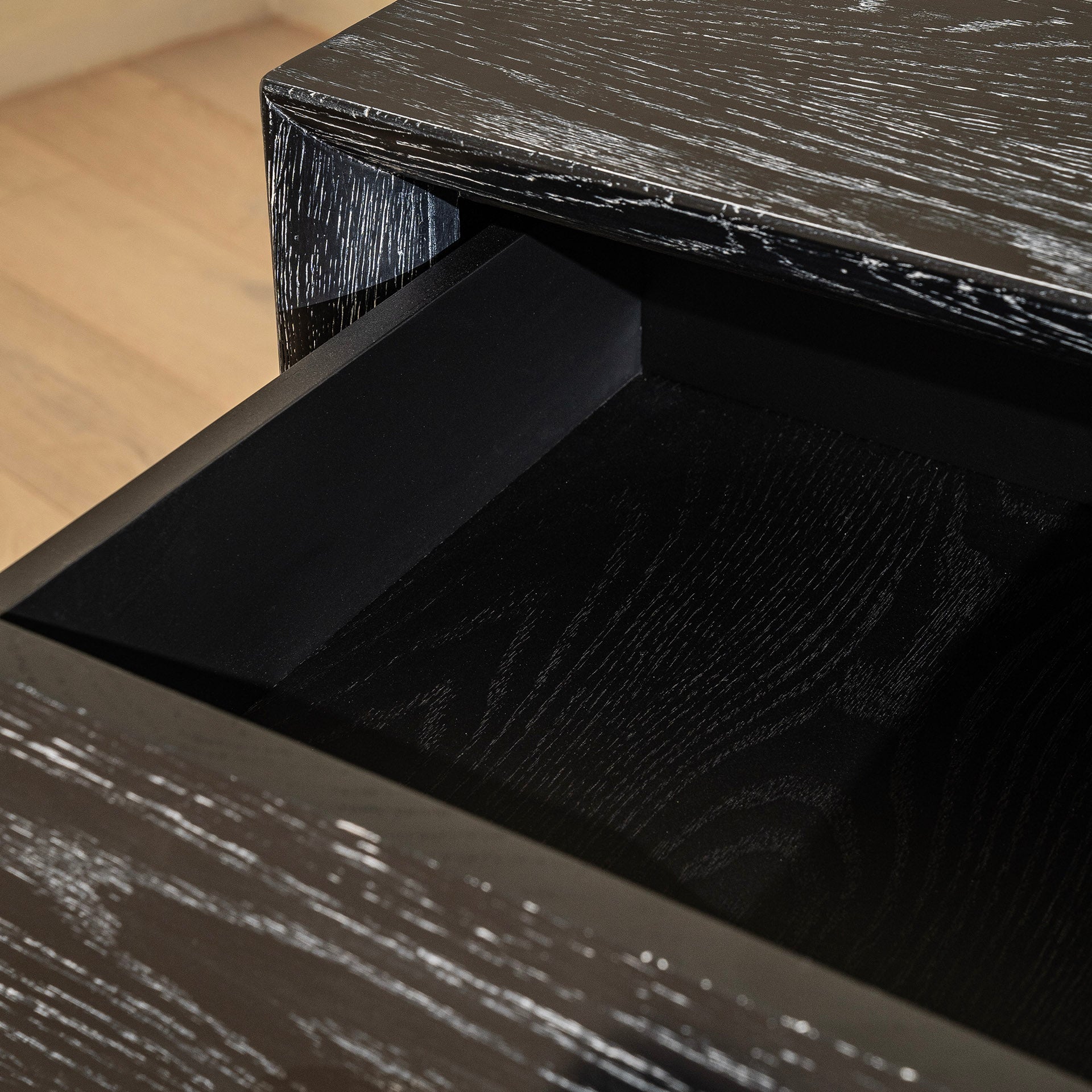 The Button dressing table is made of a solid oak veneer stained in a stunning contrasting dark black then washed through with a white stain. The finished colour is almost a very dark charcoal, brought to life with the whitewash detail in the grain. Its large button handles are its signature feature. It pairs well with its matching bedside table, both come on metal runners with soft close draws.