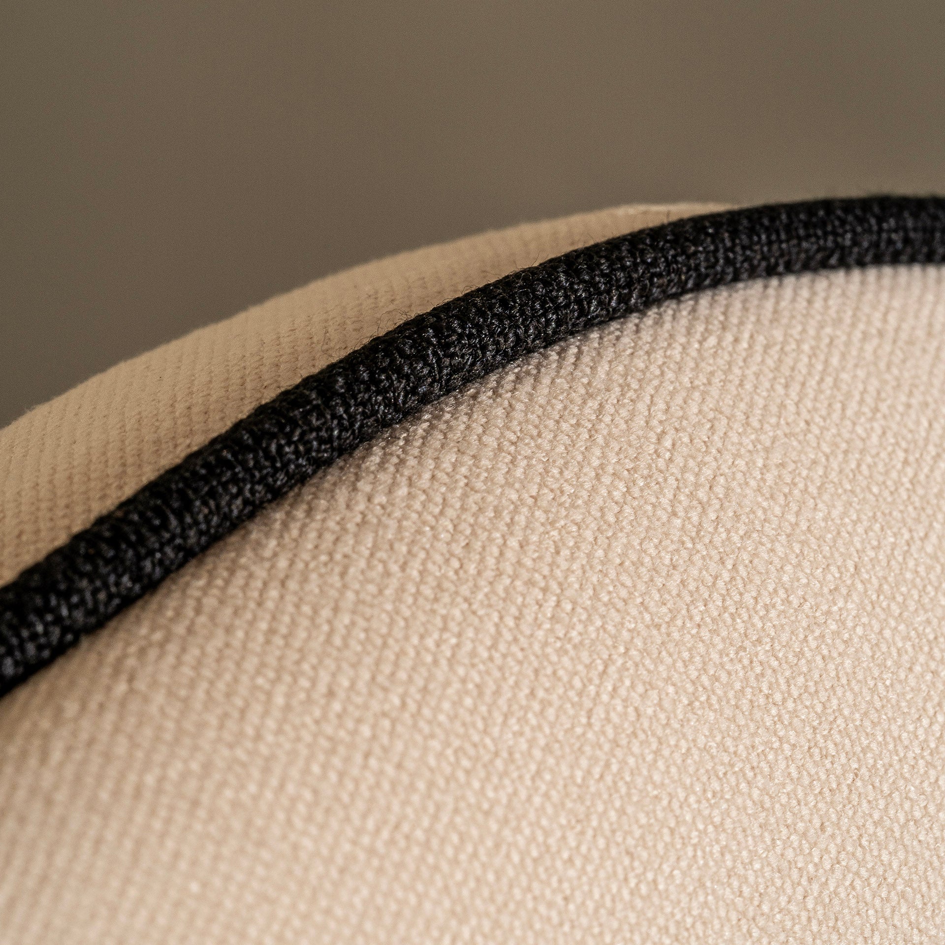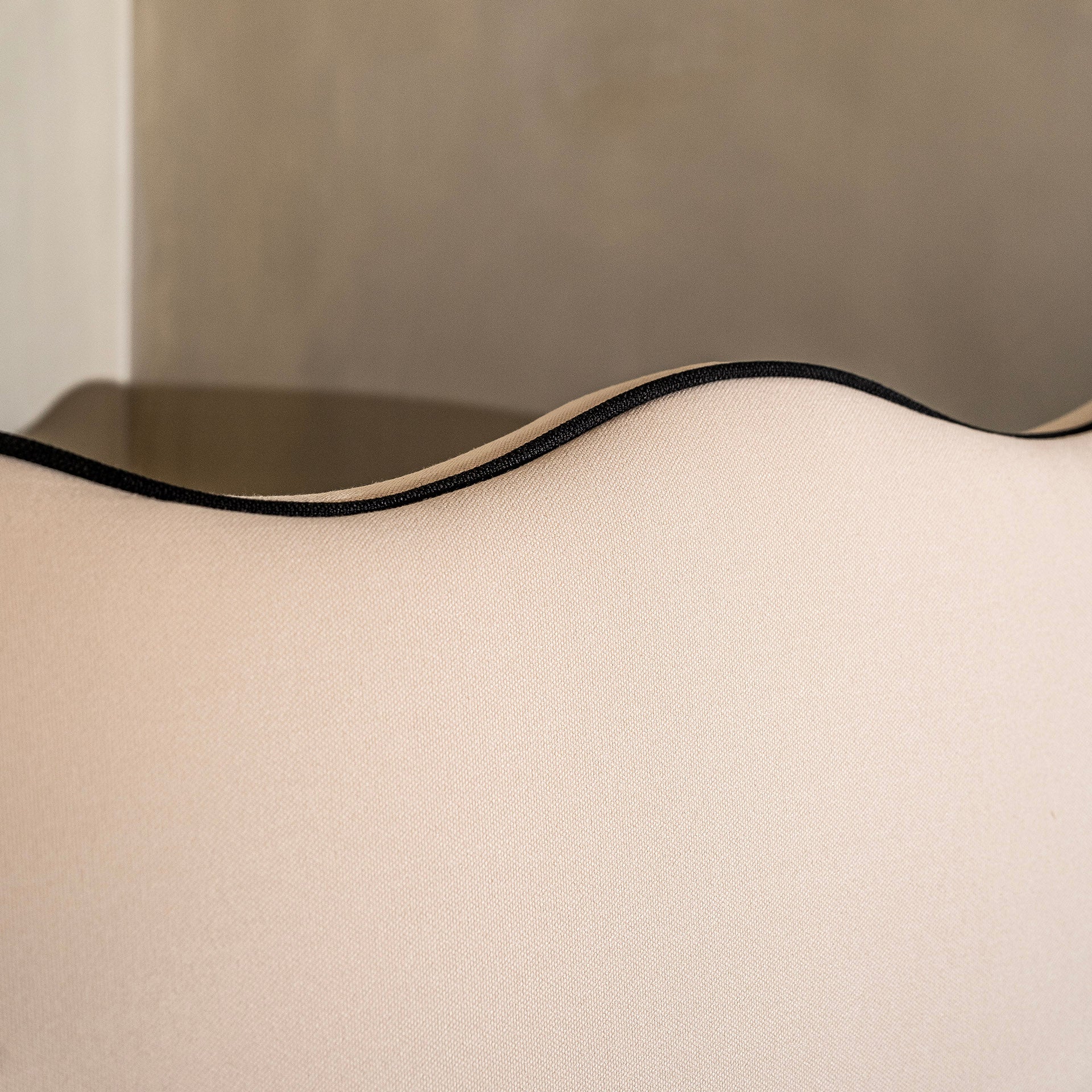The Capo is a statement piece defined by its elegant wave curved silhouette and refined detailing. Upholstered in soft off-white linen, its graceful form is accentuated by contrasting black piping that traces the contours of its distinctive top curves.