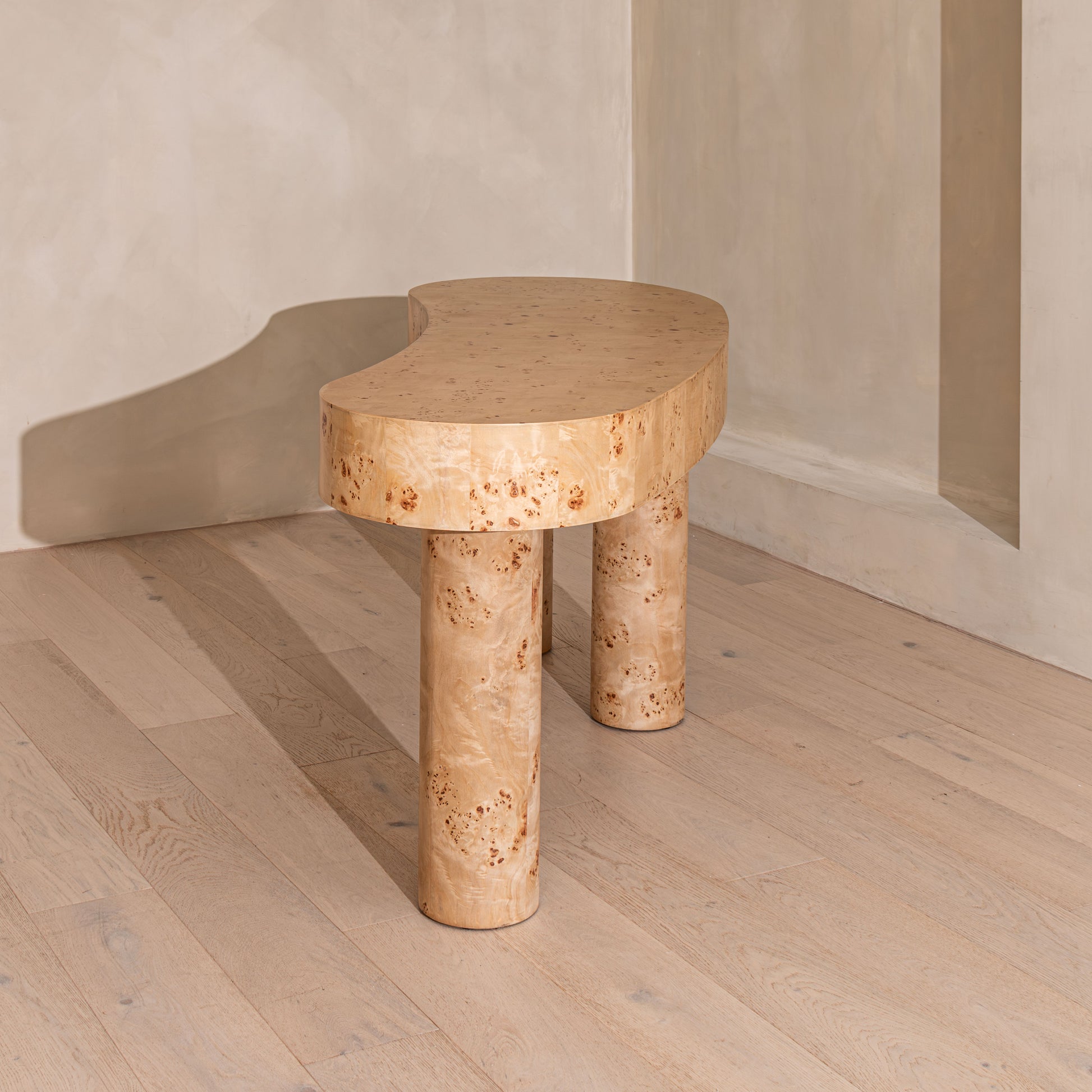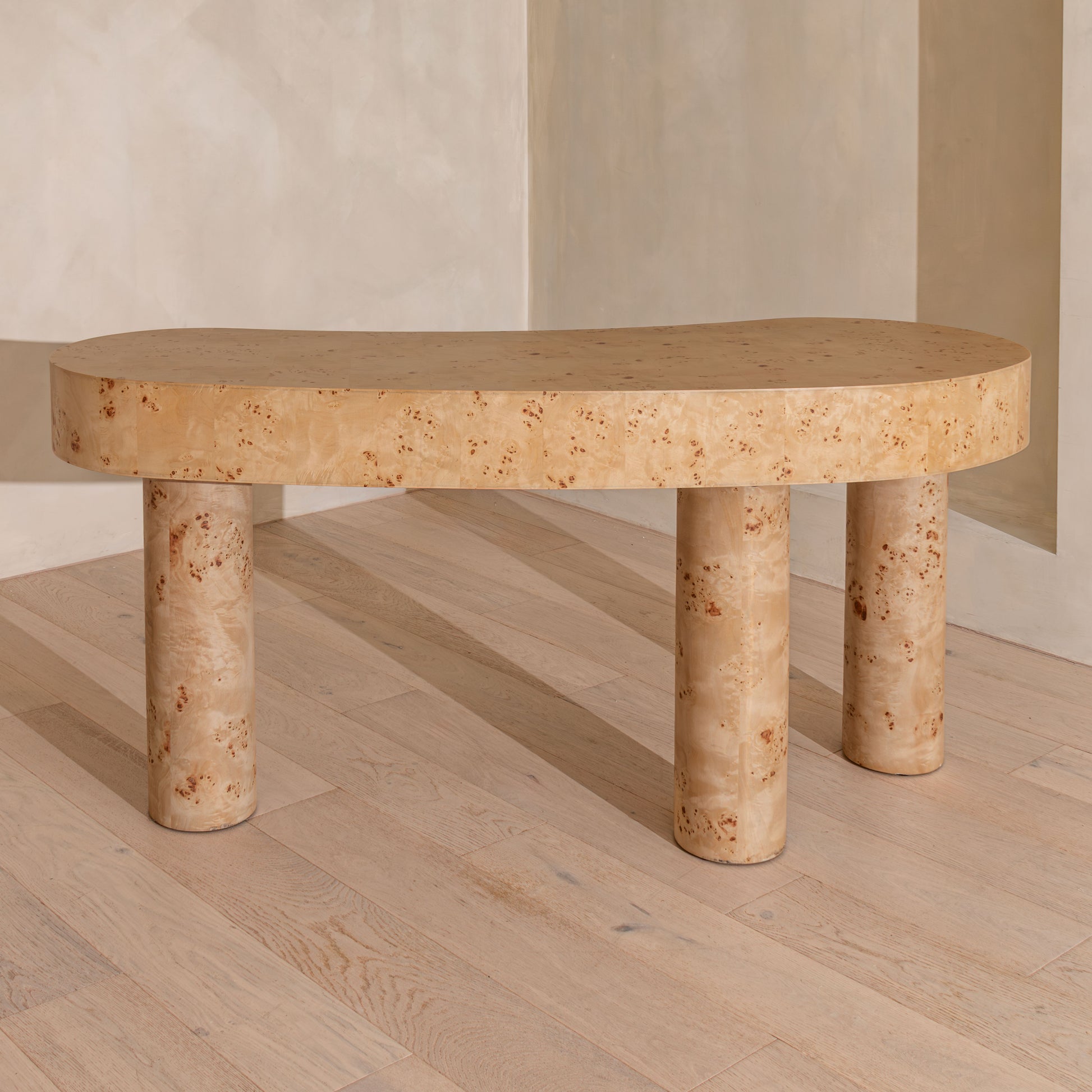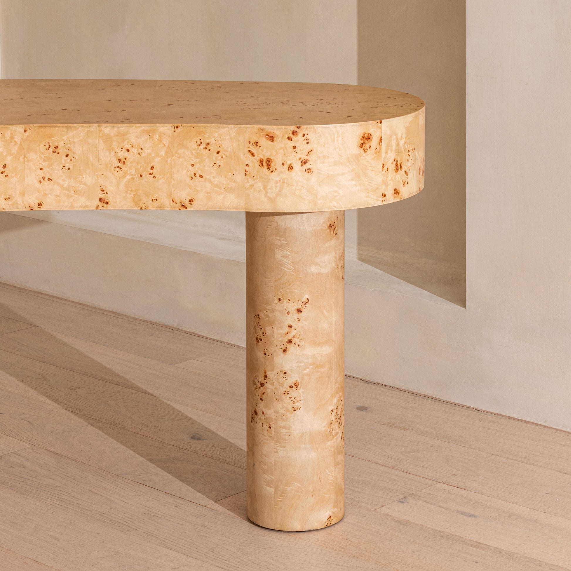 Elevated simplicity meets sculptural form. The Chadstone Desk is crafted from richly grained burl wood, featuring a smooth oval top supported by three bold cylindrical legs. Its natural finish highlights the organic variations of the timber, adding warmth and texture to any interior.