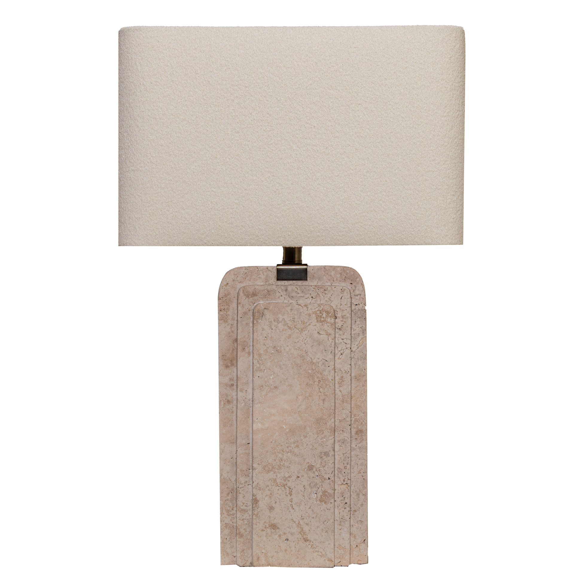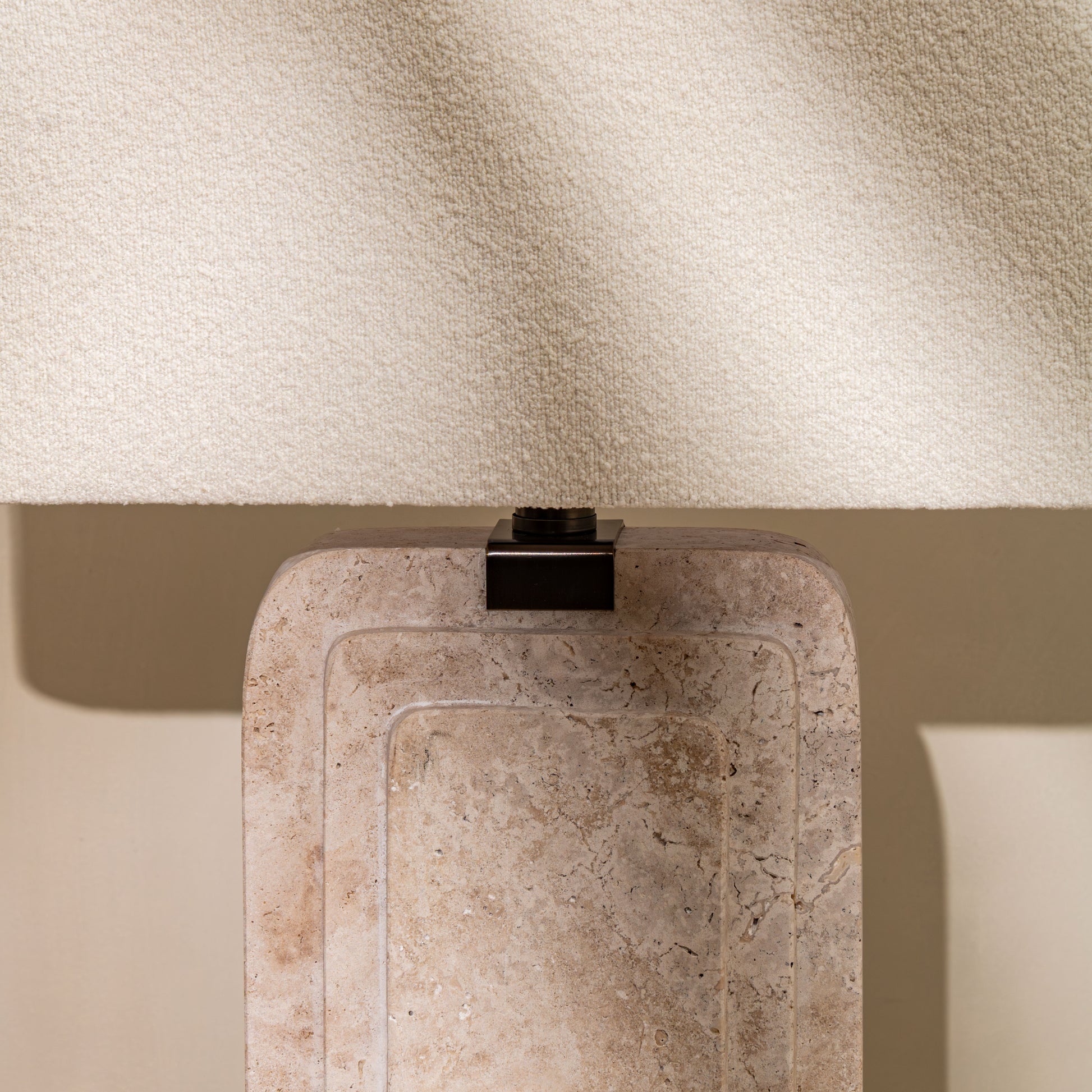 Its sculptural, stepped form is paired with a softly textured bouclé shade, creating a balanced contrast between raw materiality and softness. The warm, diffused light enhances the natural tones of the stone, making it ideal for living rooms, bedrooms, or styled console settings.