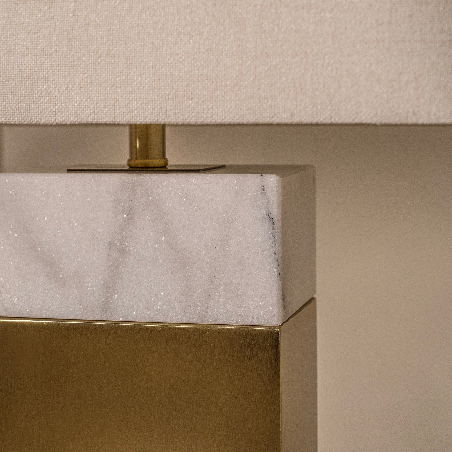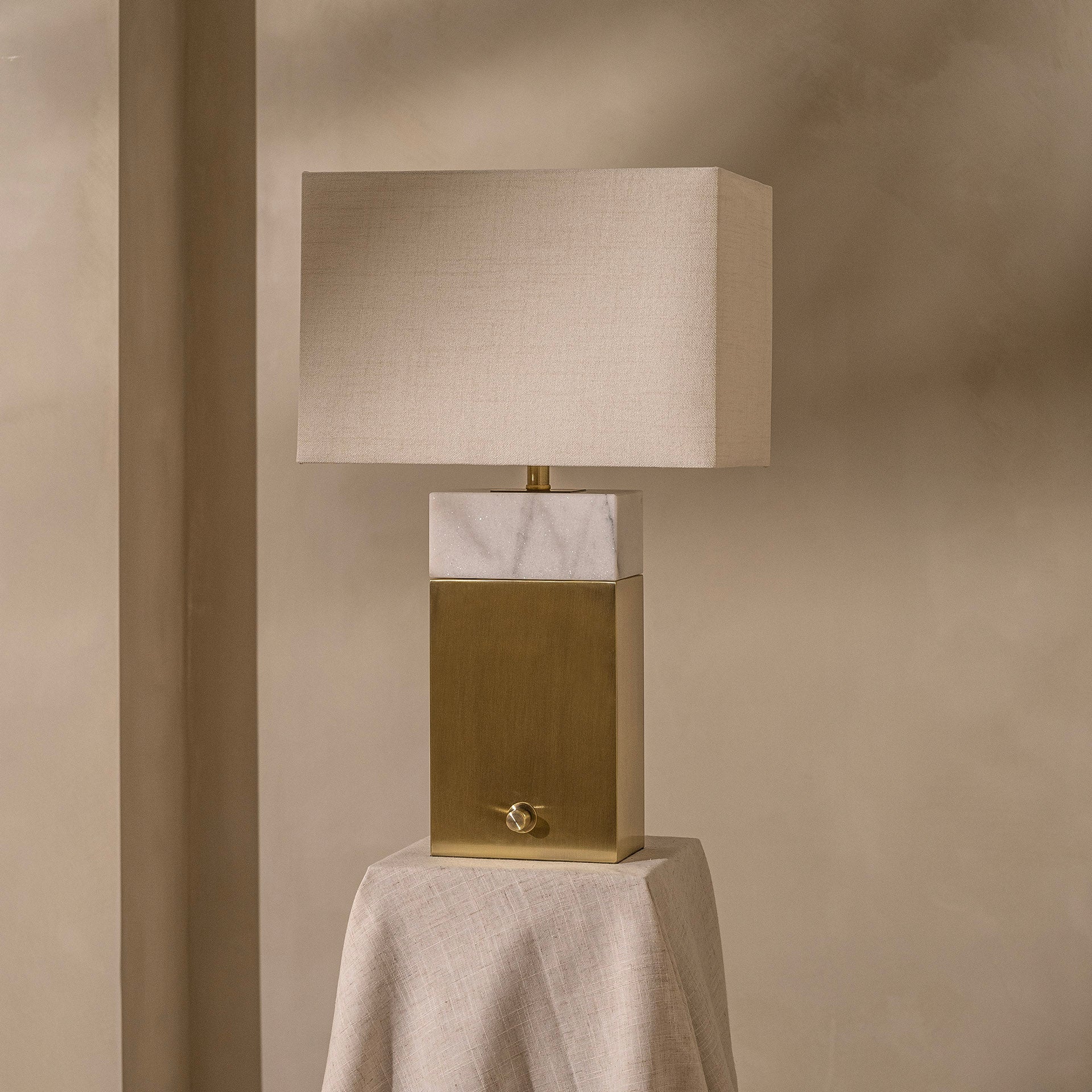 The Durham table lamp effortlessly combines sophistication and class, featuring a striking marble stone base complemented by a brushed brass finish. This stylish lamp is perfect for side tables or adding a touch of elegance to your home office. Designed for convenience, it includes an on/off control switch at its base, ensuring ease of use. All our lamps come equipped with high-quality fabric wires, seamlessly blending functionality with style.