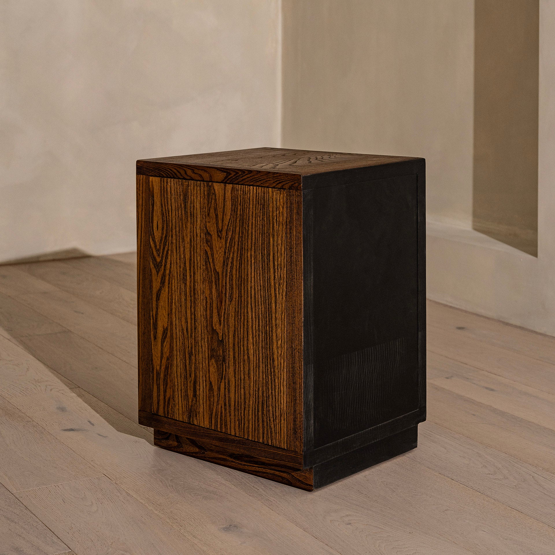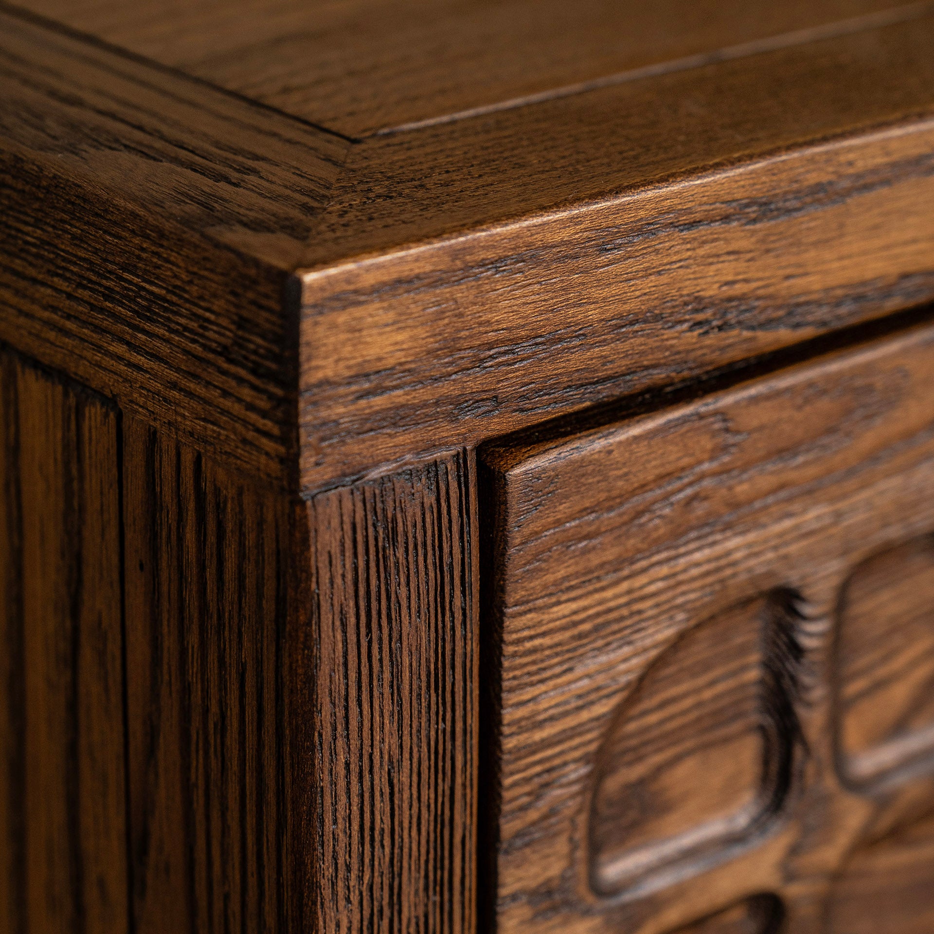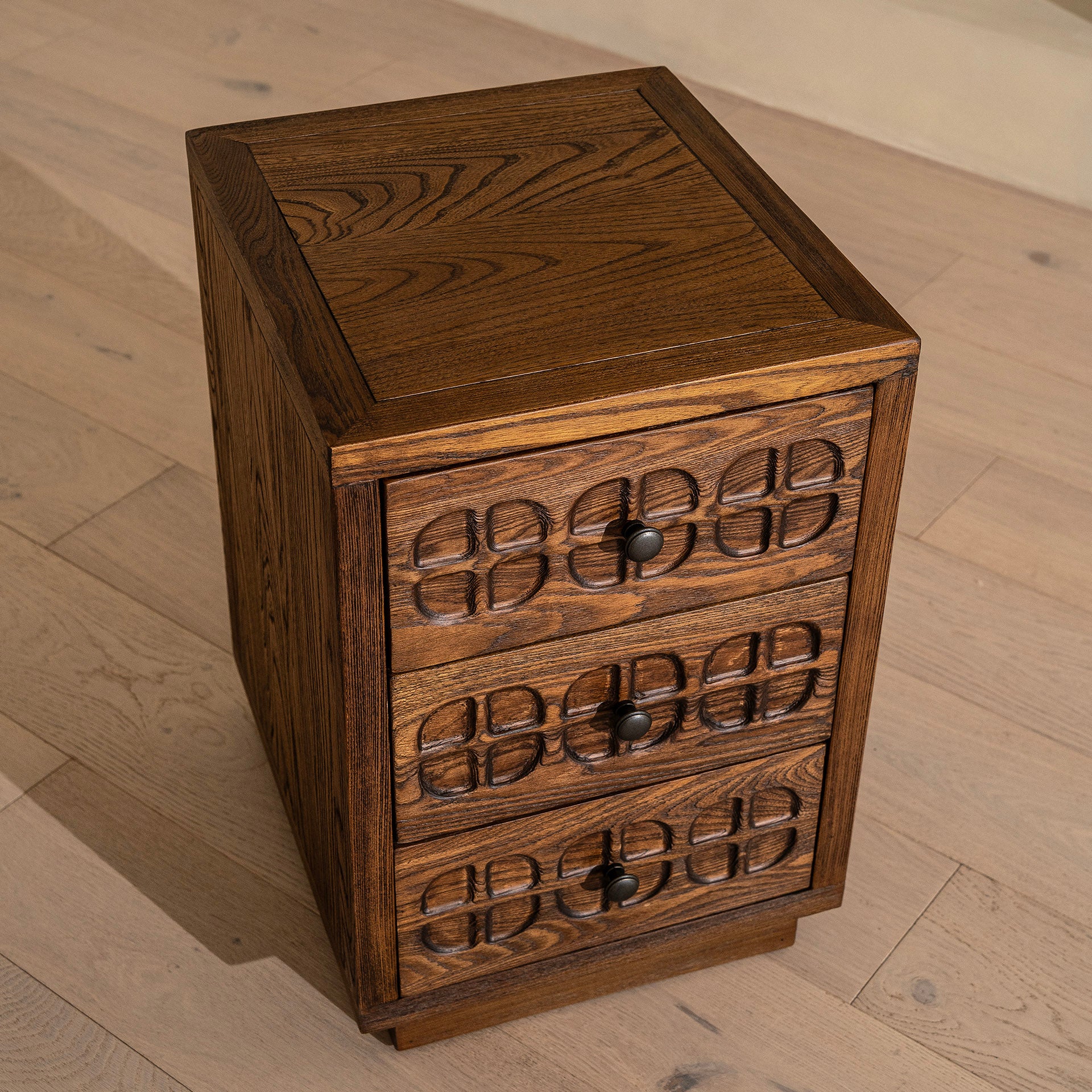 The Hargate is a narrow width 40cm dark stained oak bedside, perfect for London bedrooms or rooms where space is tight. It’s apart of the Hargate range that also includes a desk and large sideboard. It gives a mature mid-century feel to a room with its rich and warm walnut tones. The range is tide together on the distinctive pattern show here on the 3 drawers