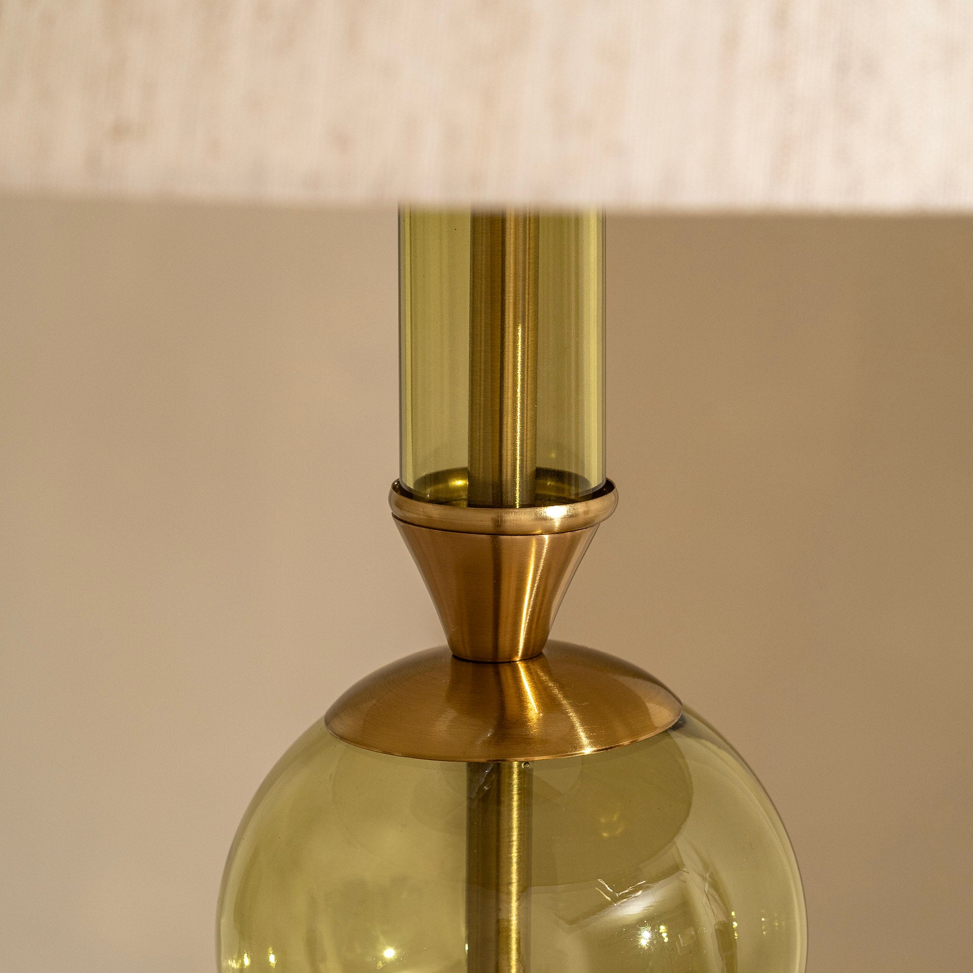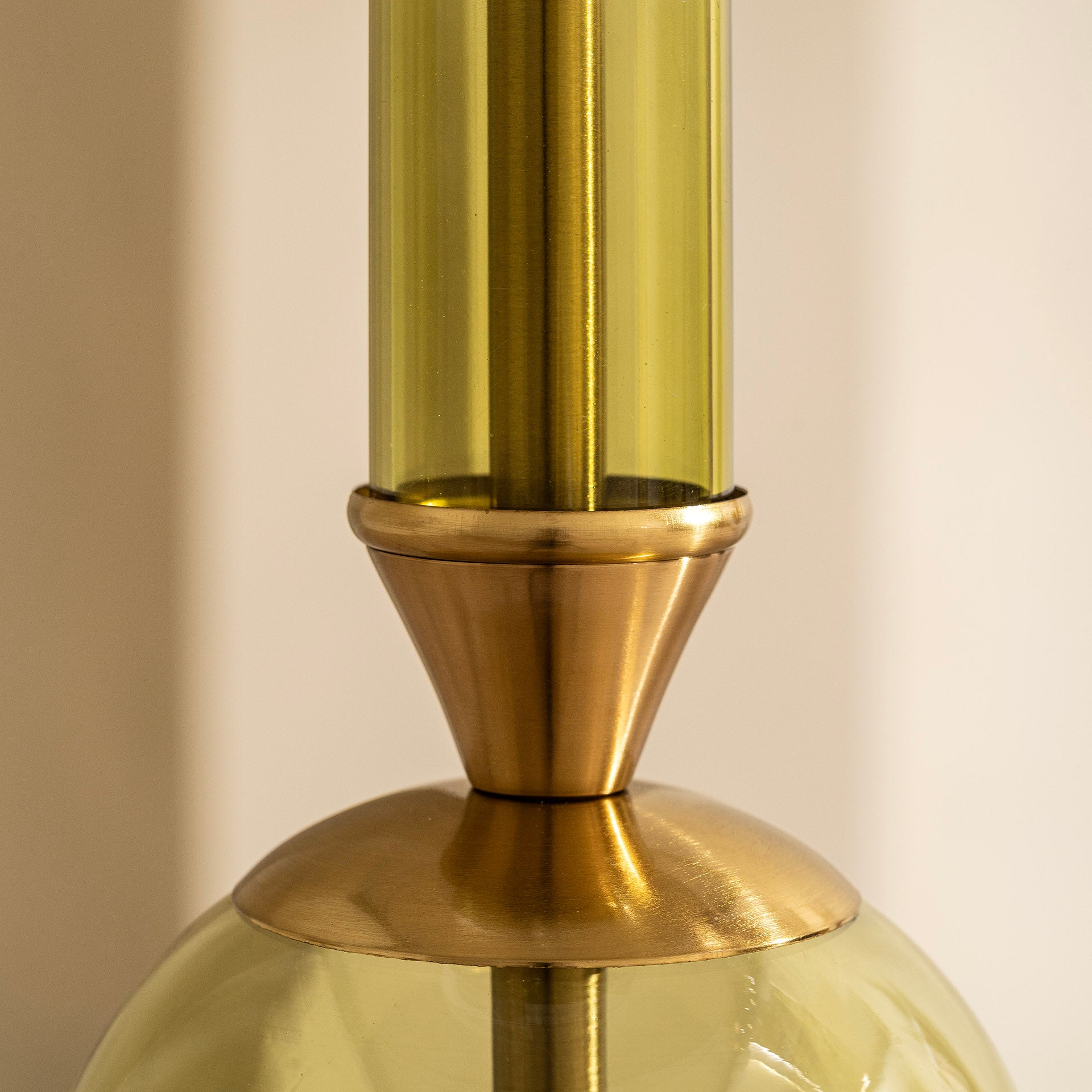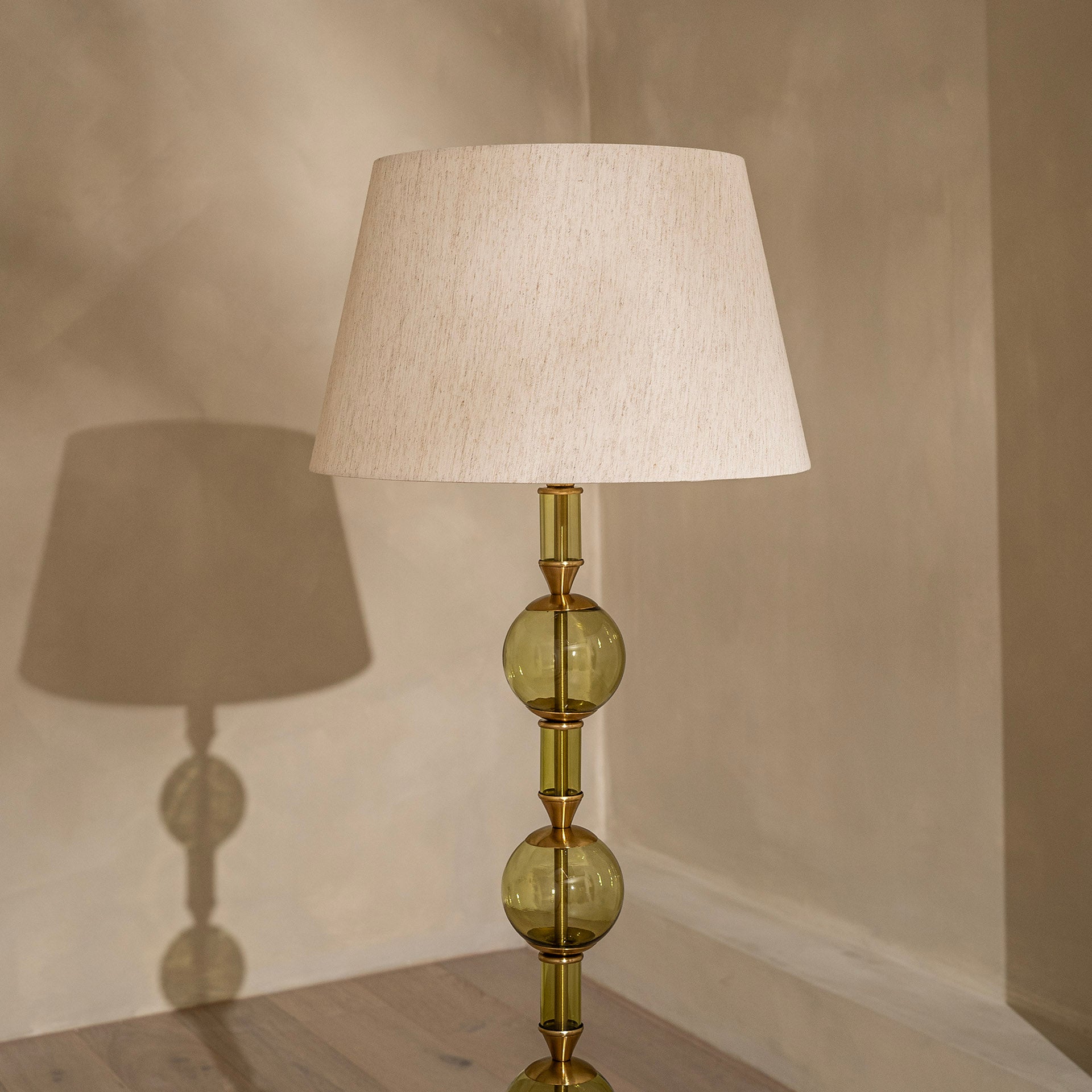 The Edition floor lamp is a striking statement piece that blends elegance with warmth. Its column features a sculptural arrangement of tinted olive glass spheres and brushed brass detailing, creating a refined and timeless aesthetic.