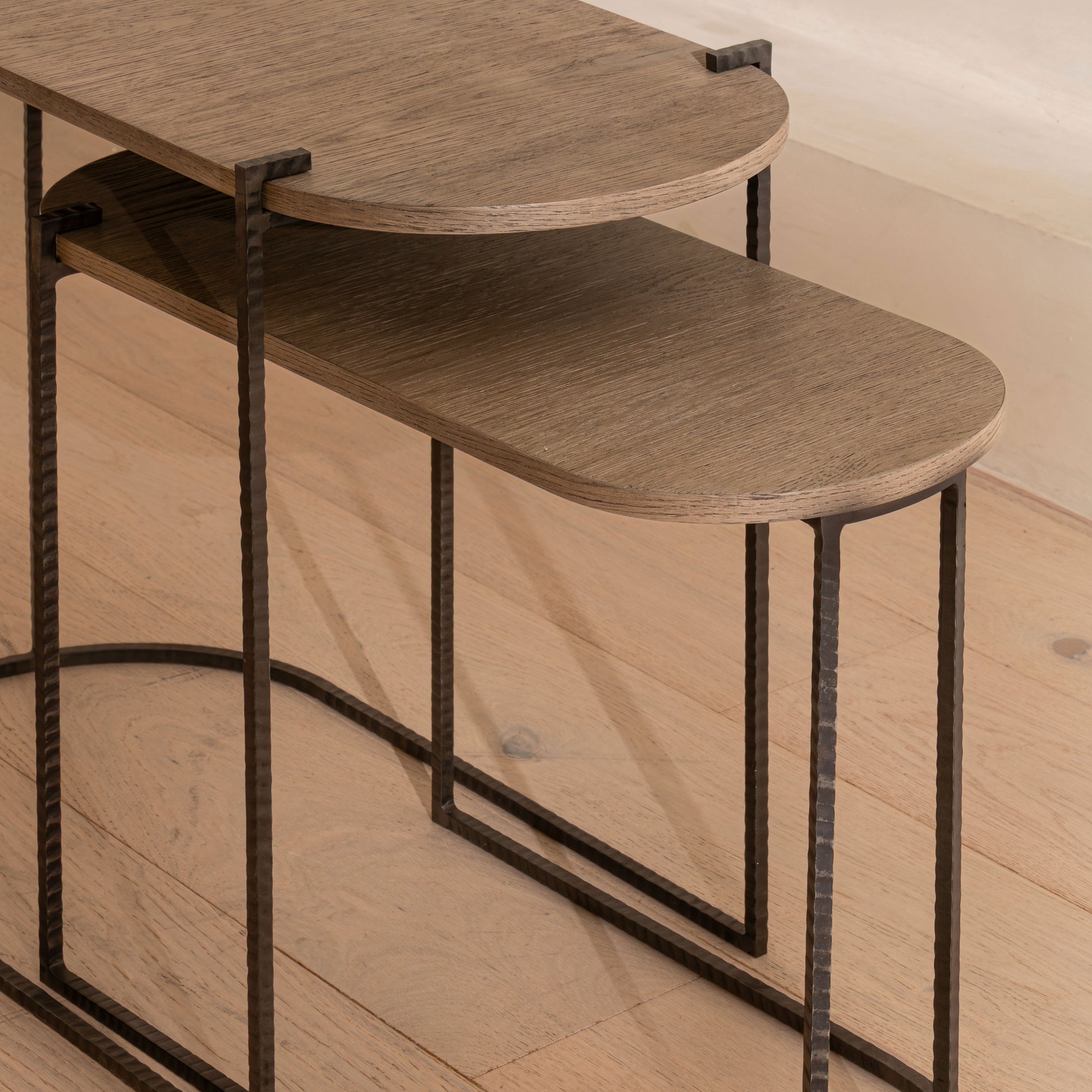 The Revera Nesting Tables combine understated elegance with artisanal charm. Featuring hand-beaten iron frames and beautifully grained farmhouse aged oak tops in a soft grey tone, these tables bring warmth and texture to any interior. Designed to be subtle yet distinctive, their oval silhouettes and slender bases create a light, airy presence perfect for both modern and rustic spaces alike.