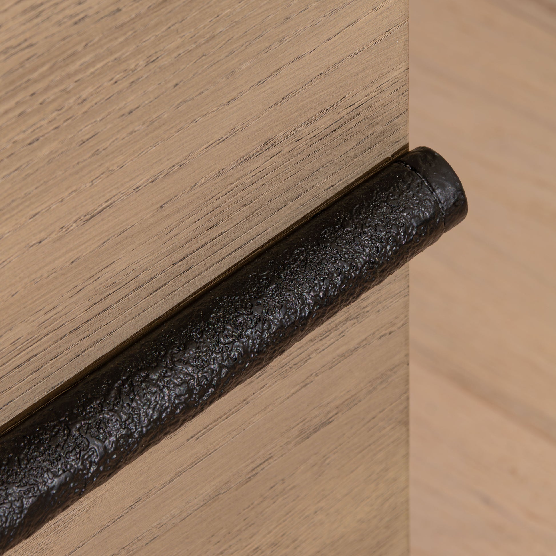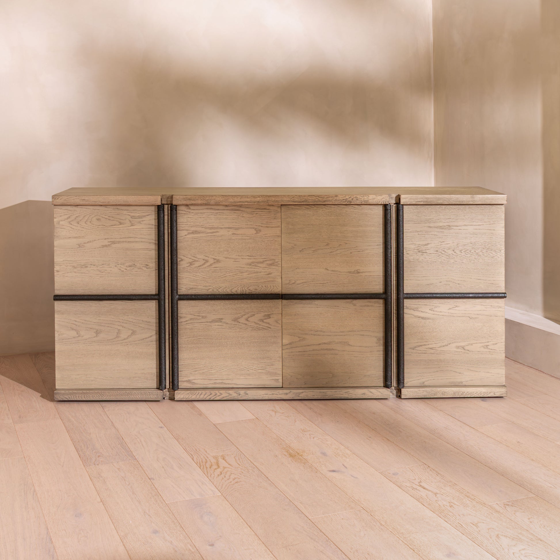 Inspired by the interiors of vineyard farmhouses in California’s Napa Valley, the Springer Sideboard blends rustic beauty with organic textures and tones. Crafted from solid oak, it features a soft light-washed grey stain that highlights the natural grain, contrasted beautifully by the textured counter-level handle framing its front. The result is a stylish piece full of character, warmth, and timeless charm.