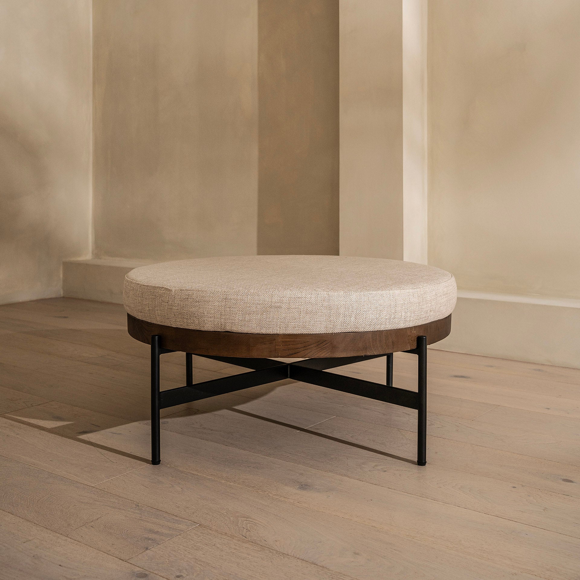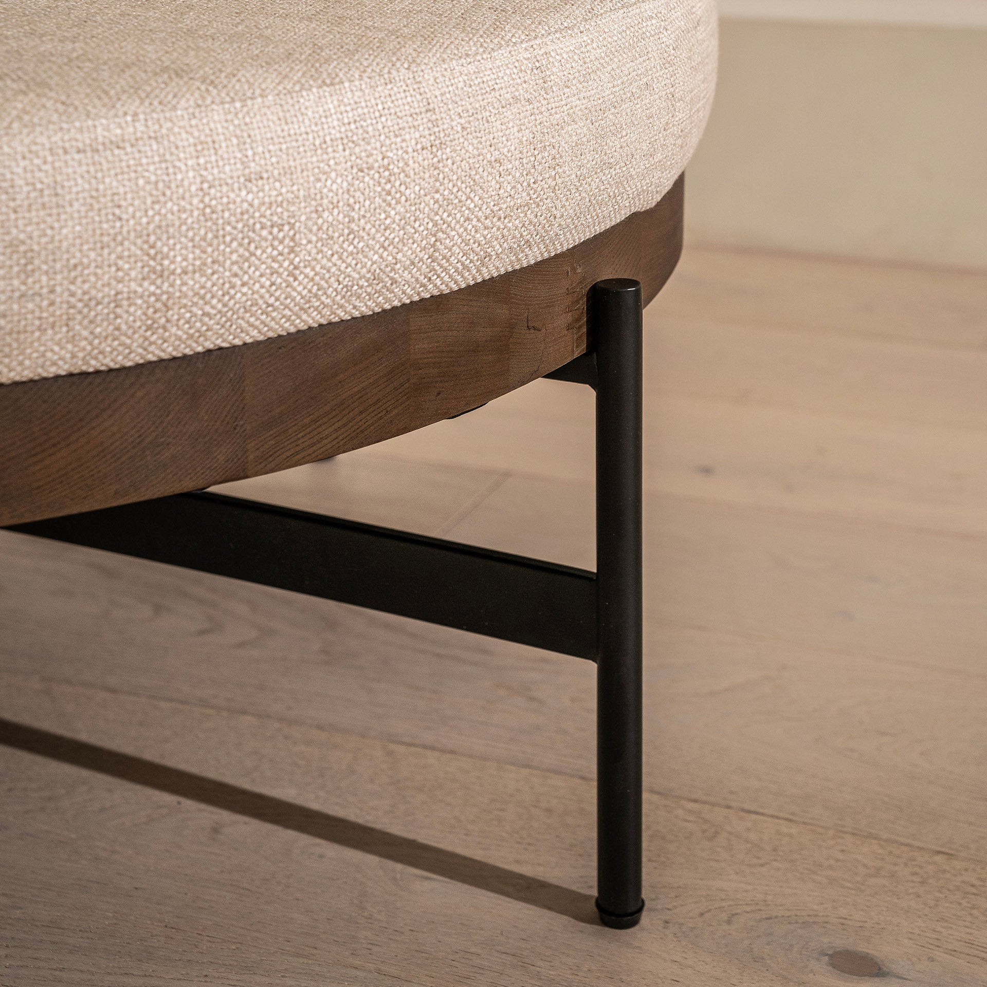 Stylish and versatile. The Ovington has an airy base of gunmetal-finished iron supports rounded beech wood with textural wheat-coloured upholstery. Perfectly scaled to create additional seating or an extra surface when topped with a tray.