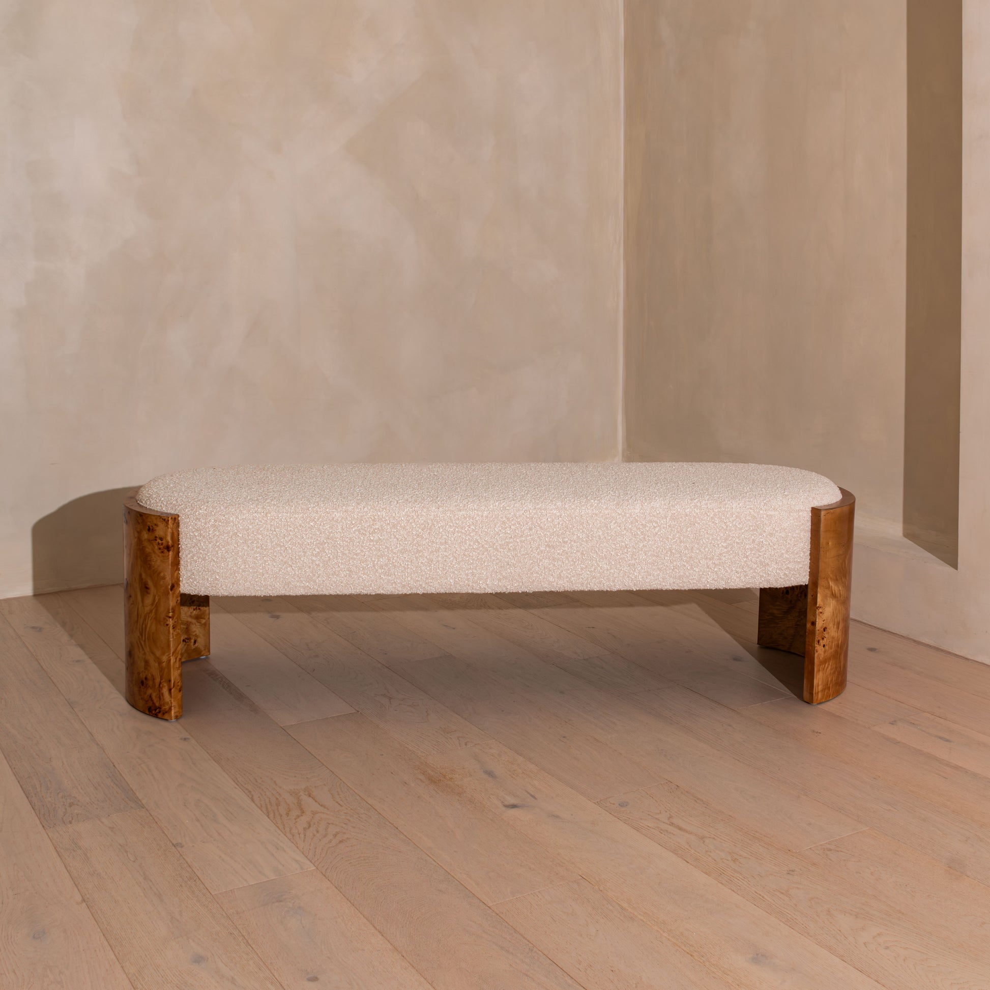 Elevate your space with the refined simplicity of the Bently Bench. This piece blends contemporary elegance with organic warmth, featuring a curved silhouette and a textured boucle seat.
