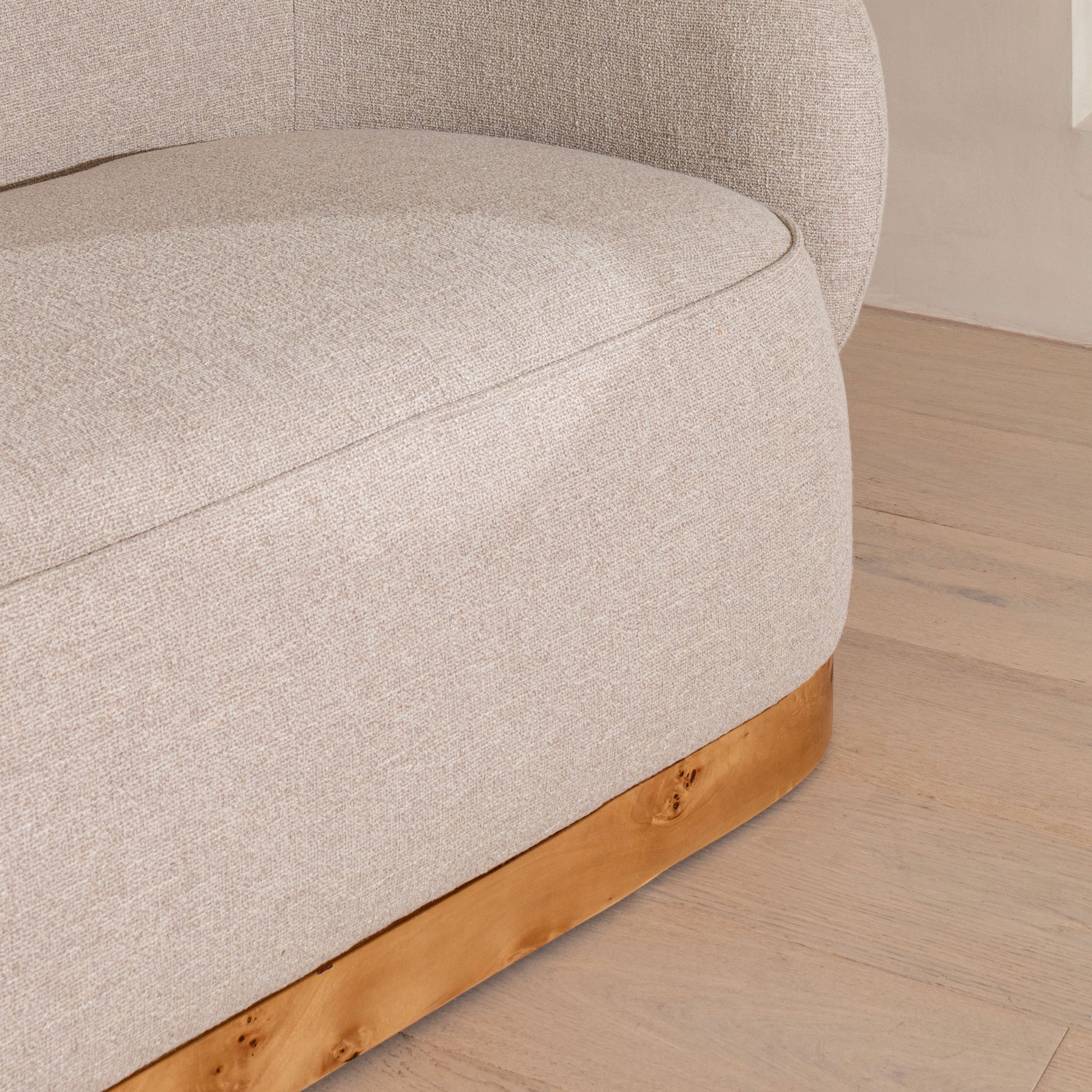 Experience the sculpted elegance of the Thornhill sofa, designed with smooth, curving lines that create a soft, embracing feel. Upholstered in a refined off-white fabric and set on a warm light-burl base, its graceful arc flows seamlessly from arm to back around a rounded seat. A stunning blend of comfort and glamour, it’s the perfect statement piece for any room.