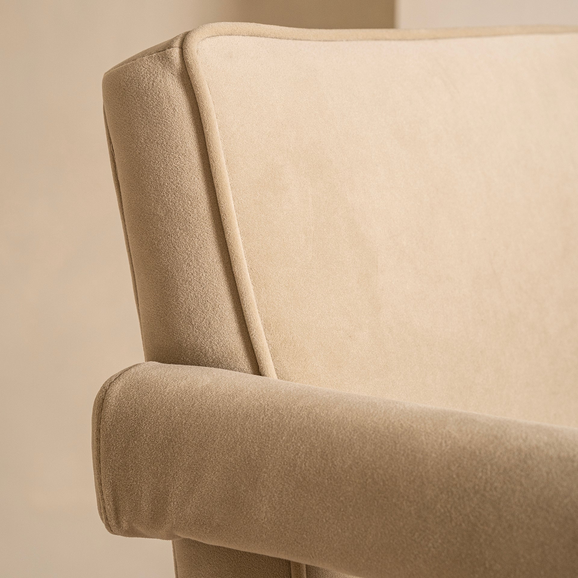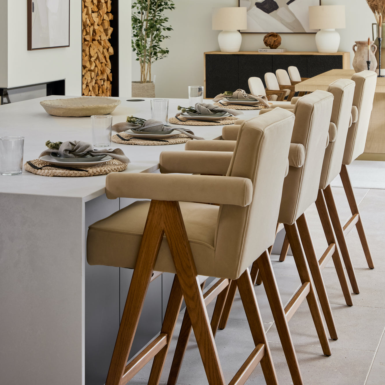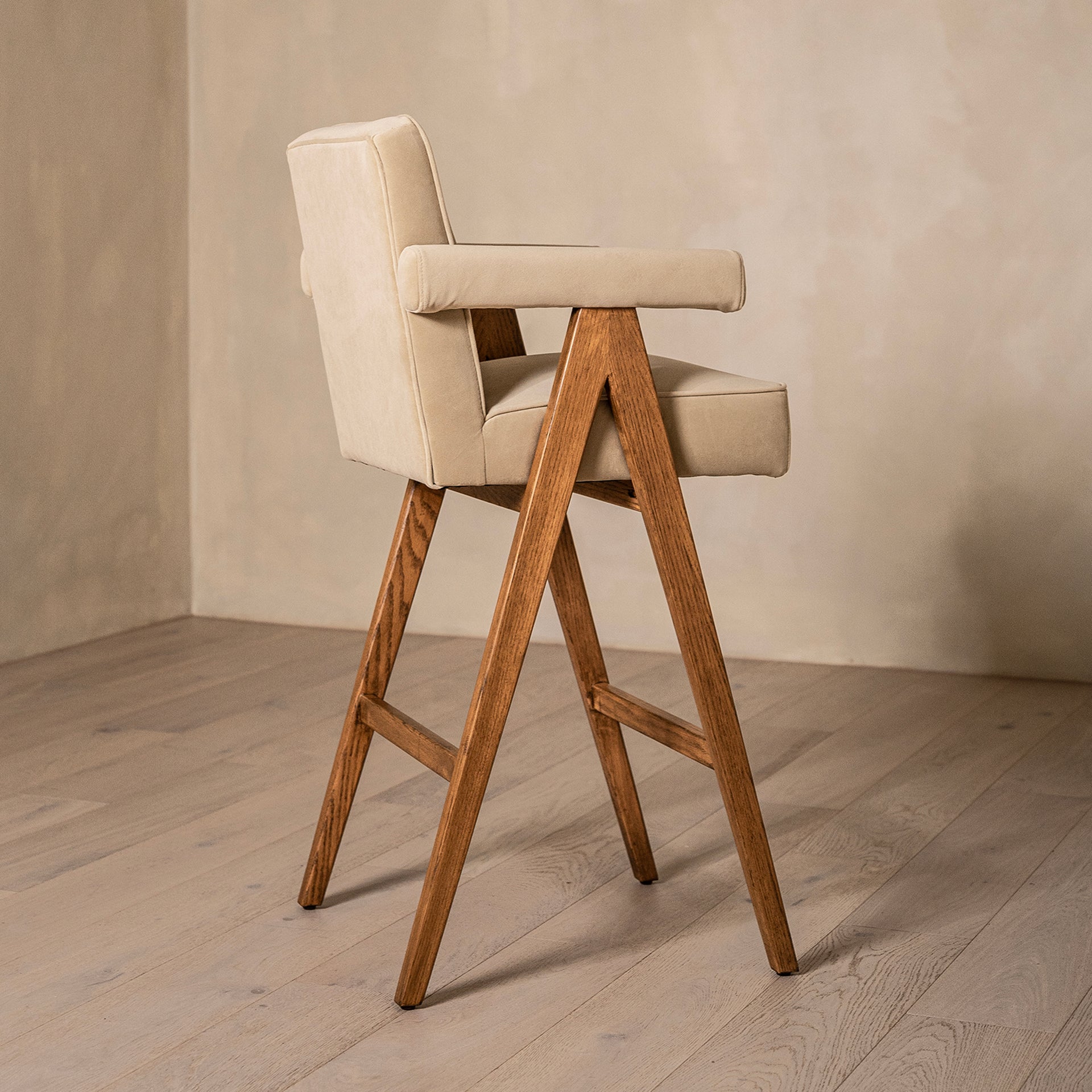 A modern take on a Midcentury classic, the Whistle Stool is a stylish bar stool with a comfortable, upholstered velvet seat and armrests. It’s made of a solid oak base that is inspired by the iconic architectural lines of Swiss designer Pierre Jeanneret. Completely made by hand it delivers the highest level of style and class.